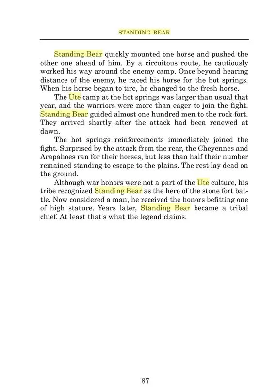 Many Indian Legends tell of this perpetual warfare for control of the prized hunting rights in Middle Park. One of the favorite legends about the struggle centers on Standing Bear, a young Ute anxious to be recognized as a man. Lending credibility to the story is the fact that a possible location of the Ute defensive that play an important part in the legend can still be found above a rocky cliff....